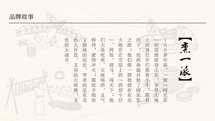 品牌故事將熏一派的由來交代的非常清楚,而且故事發(fā)生在闖關(guān)東的歷史背景下,富有傳奇色彩。圍繞這品牌故事,我們提取了熏一派的核心訴求:世代傳承,匠心入味。