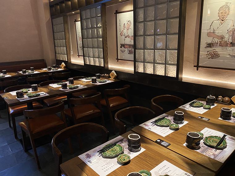 如:品深餐飲全案策劃設(shè)計的玉椿燒鳥居酒屋,設(shè)計師通過國畫手繪小品的形式展示燒鳥的制作過程,巧妙的結(jié)合在形象墻上,消費者在享受美食的同時,也理解了燒鳥的知識從而記住了玉椿燒鳥品牌。