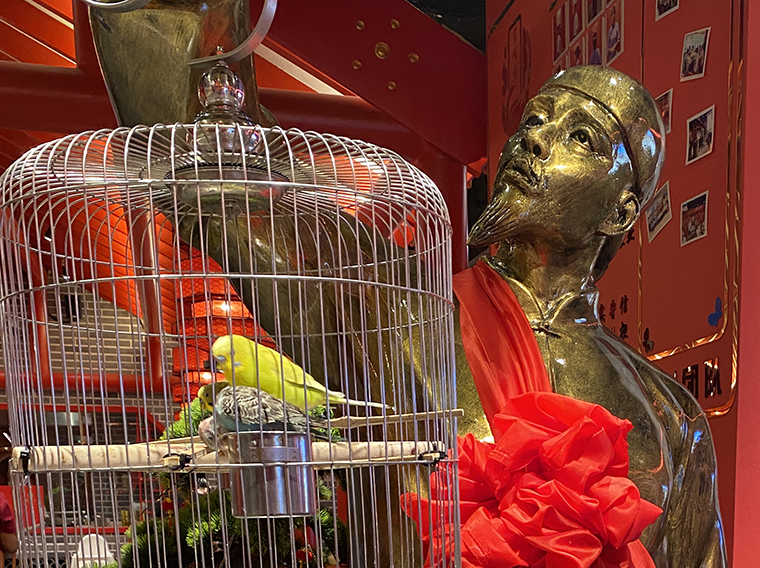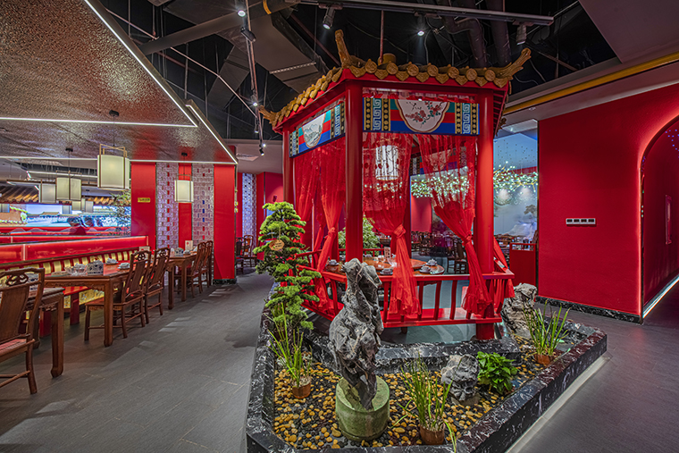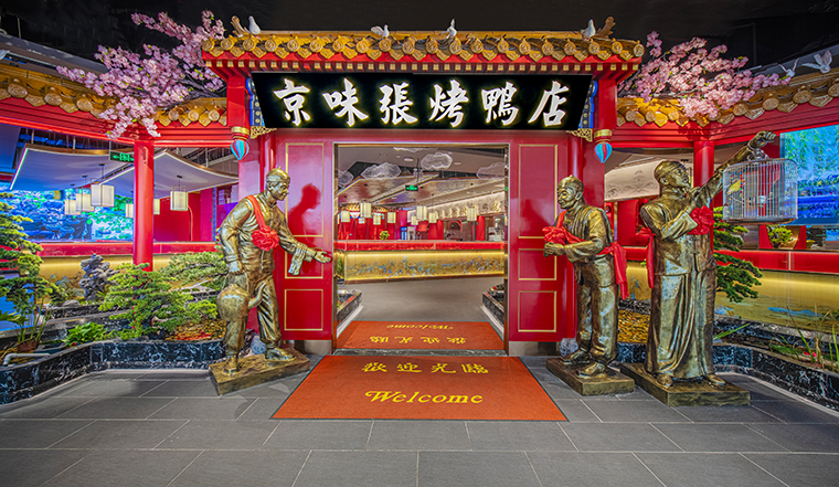 京味張的空間裝飾設(shè)計(jì)大量借鑒了中式園林造景手法,一步一小景、三步一大景,步移景異。用中國(guó)紅強(qiáng)化品牌內(nèi)含的北京皇城文化,令人印象鮮明;門(mén)口的迎賓人,提籠遛鳥(niǎo)人,跑堂人等雕塑銅人將老北京烤鴨飲食文化自然帶出;中式園林造景手法,點(diǎn)綴綠植,水景,框景,步移景異;天花的不銹鋼波紋板,一朵朵的祥云裝飾;矮隔斷的千里江山中國(guó)山水工筆畫(huà)造型裝飾,仿佛流動(dòng)的山水國(guó)畫(huà);立面的水晶玻璃磚,暗藏?zé)魩У牟AЦ魯?,空間中各種不銹鋼收邊條,明檔上的不銹鋼背發(fā)光字,現(xiàn)代裝飾材料與經(jīng)典美食交相輝映,經(jīng)典不失時(shí)尚。