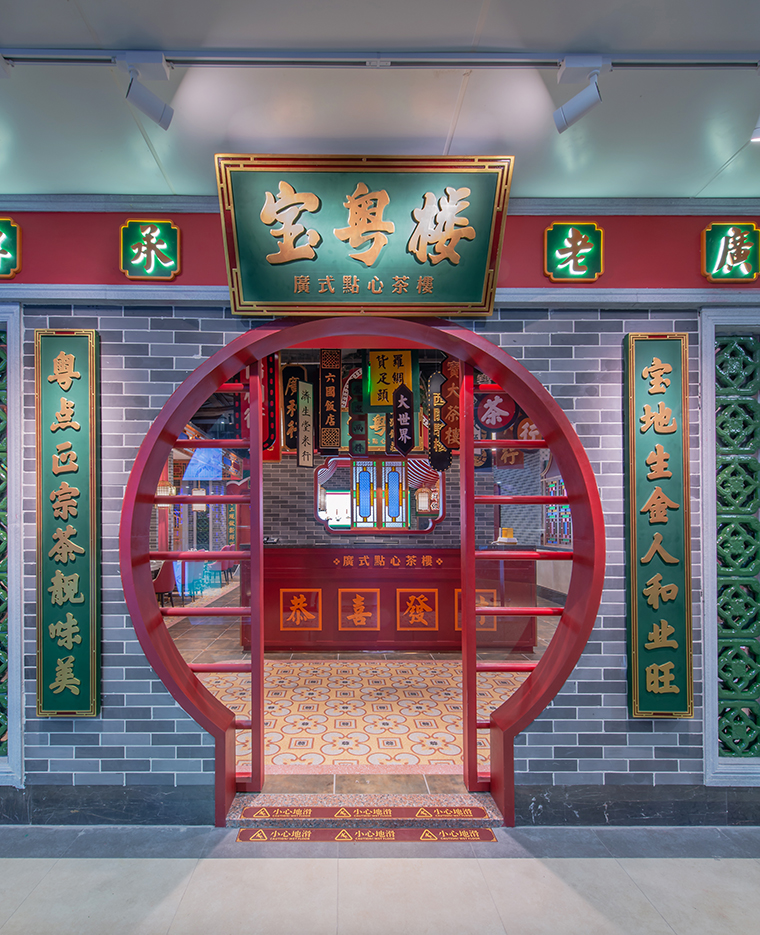 比如在廣州乃至嶺南地區,鑊耳山墻是具有獨特地域文化的一種建筑樣式,完全可以成為一種獨特的品牌傳頌符號。在廣東地區,鑊耳的山墻可擋風入巷,讓風通過門、窗流入屋內;火災時,高聳的山墻可阻止火勢蔓延和侵入,鑊耳屋象征著官帽兩耳,具“獨占鰲頭”之意,唯有功名的鄉紳方能采用,也是家境殷實的象征。在寶粵樓進門正對的收銀臺,我們就使用了經典的鑊耳山墻,讓顧客一眼就能看出廣東特色,感受到西關文化的味道。