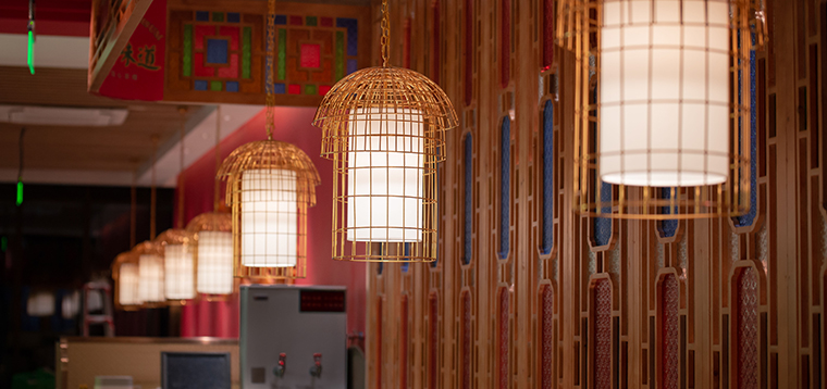 此次寶粵樓的空間軟裝陳列設計,涵蓋了餐桌餐椅、收銀臺、服務臺、收納柜、沙發坐具等餐飲家具;空間吊燈及照明裝飾設計;裝飾品、雕塑擺件、工藝品、畫藝軟裝以及最重要的品牌定制裝置軟裝。家具的主色調與品牌的主色調保持一致,椅子的款型也選用了廣州西關老式茶樓中的椅子;我們所使用的吊燈模仿鳥籠造型就是為了傳遞廣州老茶客提籠遛鳥飲早茶的悠閑幸福生活,和整個品牌文化高度契合;