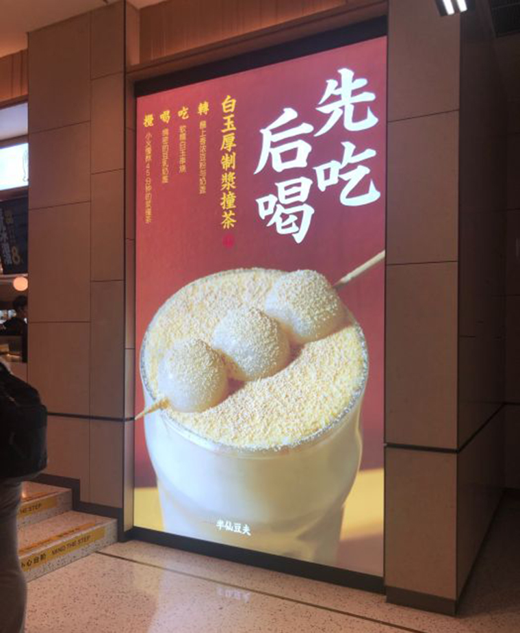 注重儀式感,豆?jié){出品前用一串日本白玉丸子橫在杯子上,并撒上豆粉,儀式感滿滿,白玉丸子蘸上香濃豆粉與奶蓋,先吃軟糯白玉串燒,再喝綿密的豆乳奶蓋,成功地把豆?jié){變成能吃的豆乳茶,引來顧客爭相拍照打卡,一時間成為網(wǎng)紅產(chǎn)品。
