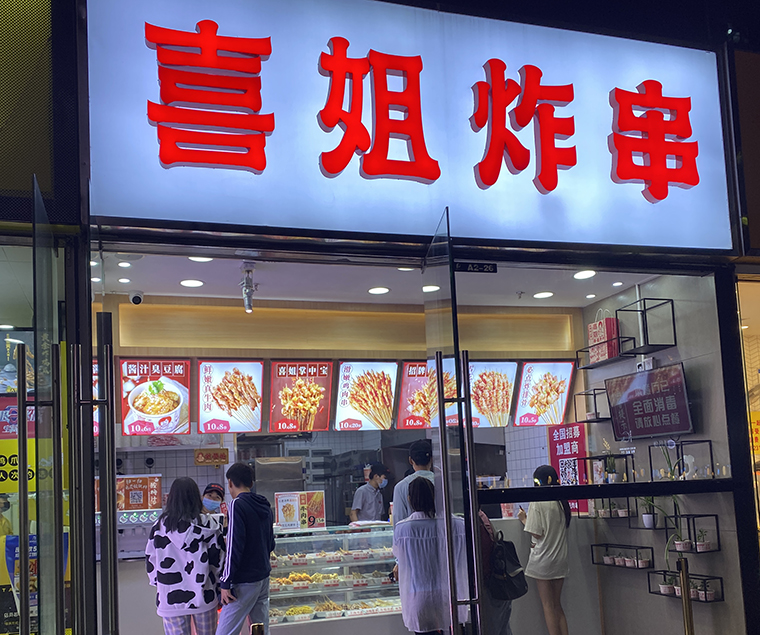 看喜姐炸串的門店裝飾裝修設計,我們來分析下喜姐炸串品牌名和門頭設計有哪些亮點,可供各位餐飲人借鑒參考。
