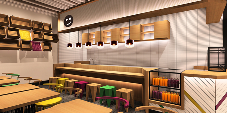 在終端門店空間形象設計上,設計師可以打造一個時尚,出挑,好玩的空間體驗。30-60平米的門店,以大面積整體白色為主,簡潔時尚,小而精,小而美,塑造有品牌特色,有文化有追求的連鎖餐飲空間形象。