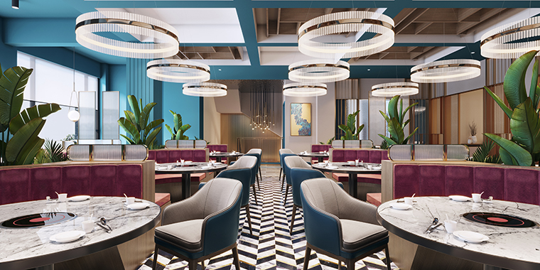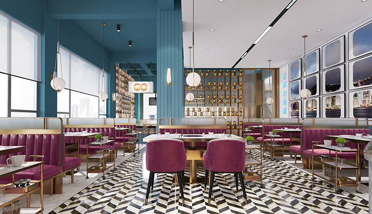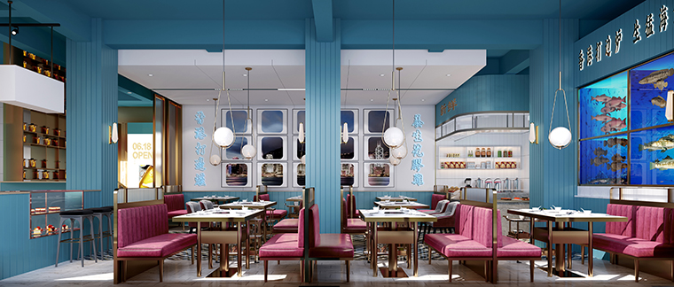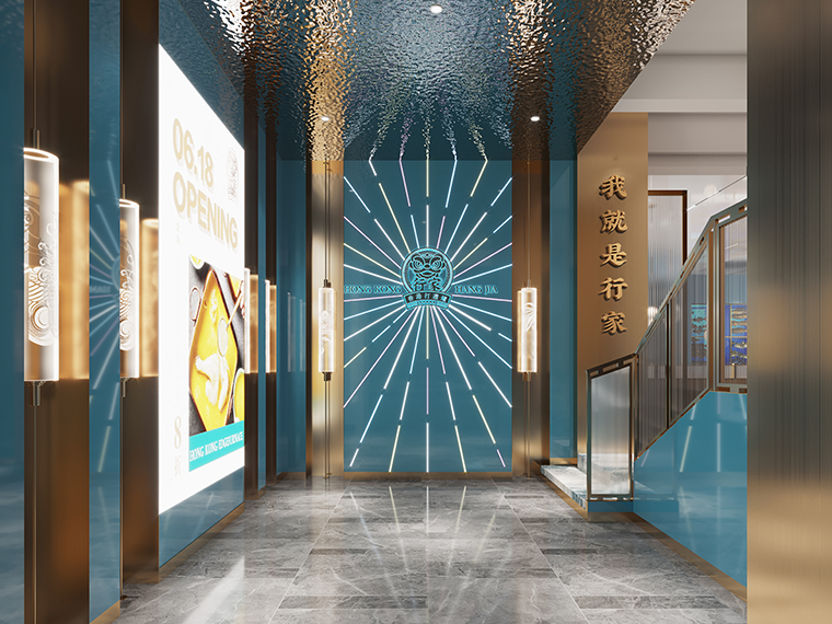 根據(jù)行家港式火鍋的品牌定位,我們餐廳的整體氛圍應(yīng)該輕奢且品質(zhì)感很強(qiáng);熱鬧卻不喧囂,精致有特色但容易讓人親近!整個餐廳的色彩以暖色調(diào)的不銹鋼金色為主,凸顯火鍋的用餐熱鬧,同時也讓顧客更容易親近,柜體運(yùn)藍(lán)色表達(dá)出鮮明的港式風(fēng)格,同時也點明我們海鮮火鍋的特色。