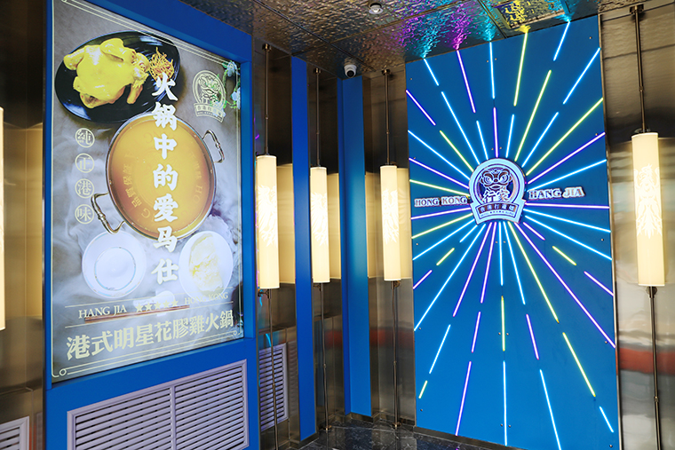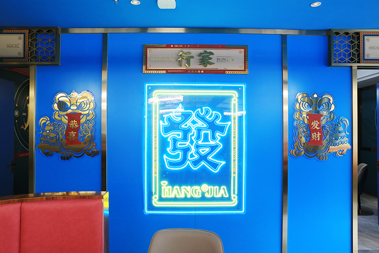 餐廳的主入口處,人流最密集之地,也是品牌首選的亮相之處。展現(xiàn)品牌主形象LOGO,以香港常見的霓虹燈材質(zhì),四周放射性線條,極具識別度,既有鮮明的港式風(fēng)格,又能吸引消費者打卡拍照分享;上樓梯處再用不銹鋼金屬字強(qiáng)調(diào)品牌名字“我就是行家”;1樓大廳一整面墻的香港城市景色照片,讓消費者有一種身臨其境的感受;二樓大廳正面形象墻以行家牌匾+立體浮雕醒獅,最經(jīng)典的港式匾額傳達(dá)花膠雞悠久厚重的歷史,兩側(cè)喜慶的南派醒獅,吉祥又可愛,與品牌LOGO彼此呼應(yīng)。