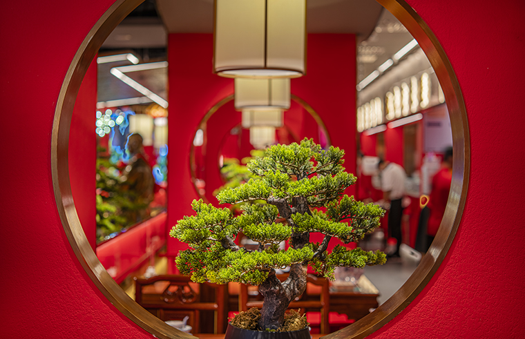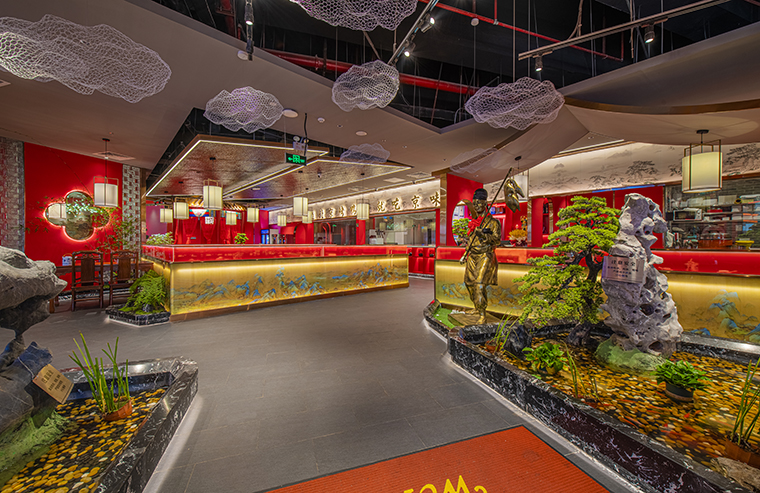 門口的迎賓人,提籠遛鳥(niǎo)人,跑堂人等雕塑銅人將老北京烤鴨飲食文化自然帶出;空間大量借鑒中式園林造景手法,點(diǎn)綴綠植,水景,框景,步移景異;
