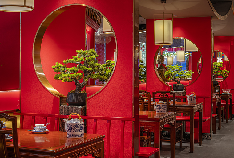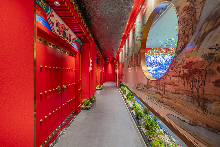 2、里悅里店品牌在空間中體現(xiàn)的比較少,更多通過(guò)大面積的中國(guó)紅,立面造型則大量使用北京故宮高精度實(shí)景照片做成軟膜發(fā)光燈箱,效果整體也不錯(cuò),但與京味張品牌的關(guān)聯(lián)度還不夠緊密。
