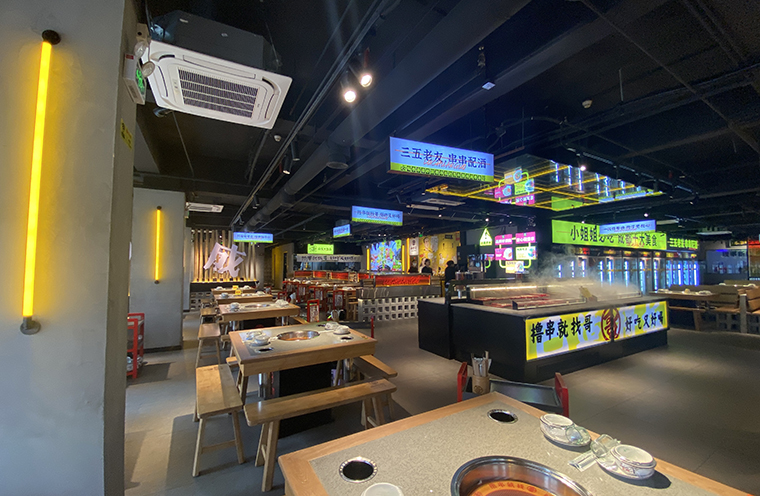 2、鹵串香火鍋對菜品照明要求不高,所以我們沒有使用吊燈,僅使用軌道射燈,滿足空間氛圍照明和功能照明即可。其他用廣告燈箱的照明來增強氛圍感,效果也不錯。墻體柱子則使用了燈管暖光,性價比高,氛圍也好。