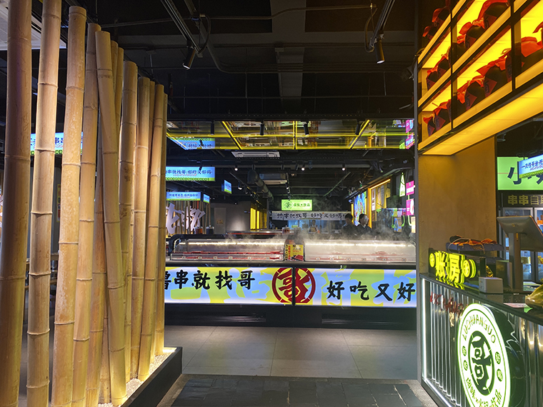 1、火鍋店就需要熱鬧的煙火氣,市井氣,鹵串哥門店一律不做吊頂,只在局部區域如甜品間、收銀區和接待區做局部裝飾;地面使用灰黑耐臟耐滑瓷磚;不做或者少做立面復雜造型,使用簡單好買,性價比高的常規材料。鹵串哥用品牌強關聯的具體一個元素串聯整個裝飾,形成品牌專屬識別記憶。空間中我們使用了竹元素,做了一面竹墻,材料、工藝都非常簡單,造價也很低廉,竹墻又與竹椅、竹簽,形成呼應關系,與品牌傳達的袍哥人家,有節有義,高度吻合,特色非常鮮明,顧客很喜歡,紛紛拍照傳頌。