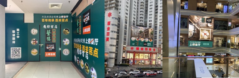 在商場外部廣告宣傳方面,品深餐飲設計在商場一樓大廳的羅馬柱、商場正面戶外大廣告畫面。重點突出品牌名稱、產品特色,讓周邊街坊、地鐵進出站乘客抬眼就能看到我們;商場