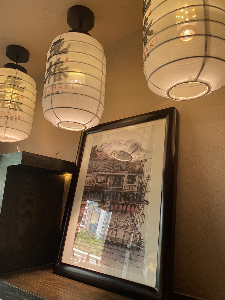 玉椿要傳達(dá)京都味道,地域文化就是美食地道的證明。我們從門頭開始到天花吊頂、地面鋪設(shè)、墻面涂料、燈光、家具等各方面圍繞“京都味道、匠傳玉椿”來展開步移景異,一步一景的空間效果圖設(shè)計。
